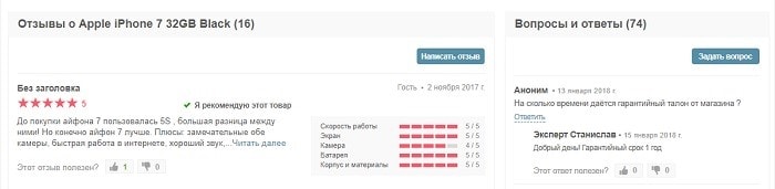 Это очень удобная и полезная функция, ведь на ее основе можно делать субъективные выводы относительно продукта. Еще один плюс в карточке товара - взаимодействие магазина со своими клиентами. Помимо отзывов здесь есть возможность оставить вопрос и получить на него ответ от консультантов компании. Отличная идея, как, впрочем, и сам магазин.
