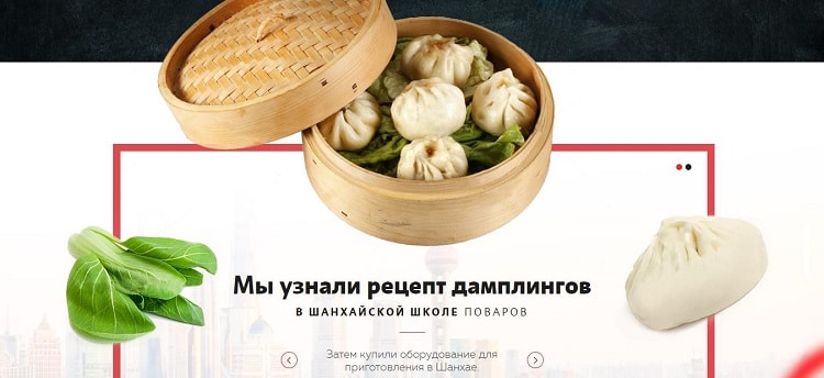 Сайт ресторану паназіатської кухні від першого розвороту вражає своїм функціоналом. На динамічному фоні розміщена форма, яка дозволяє користувачеві дізнатися, чи є у нього можливість замовити виїзд персоналу на місце для організації харчування на виїзному заході.