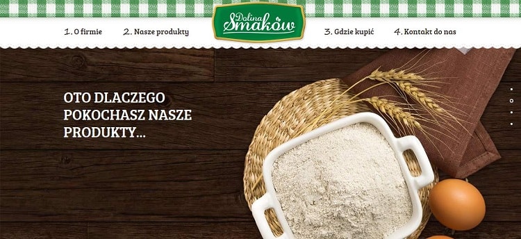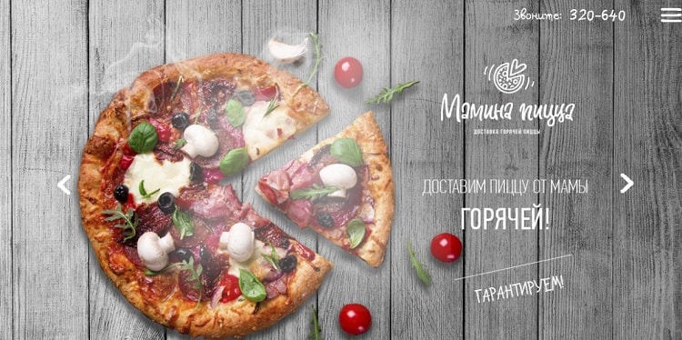 Зручний у користуванні та красивий сайт з інтуїтивно зрозумілою навігацією. Головна сторінка виконана у вигляді всього одного розвороту, де демонструється фото їжі та навігація у вигляді 6 переходів на категорії.