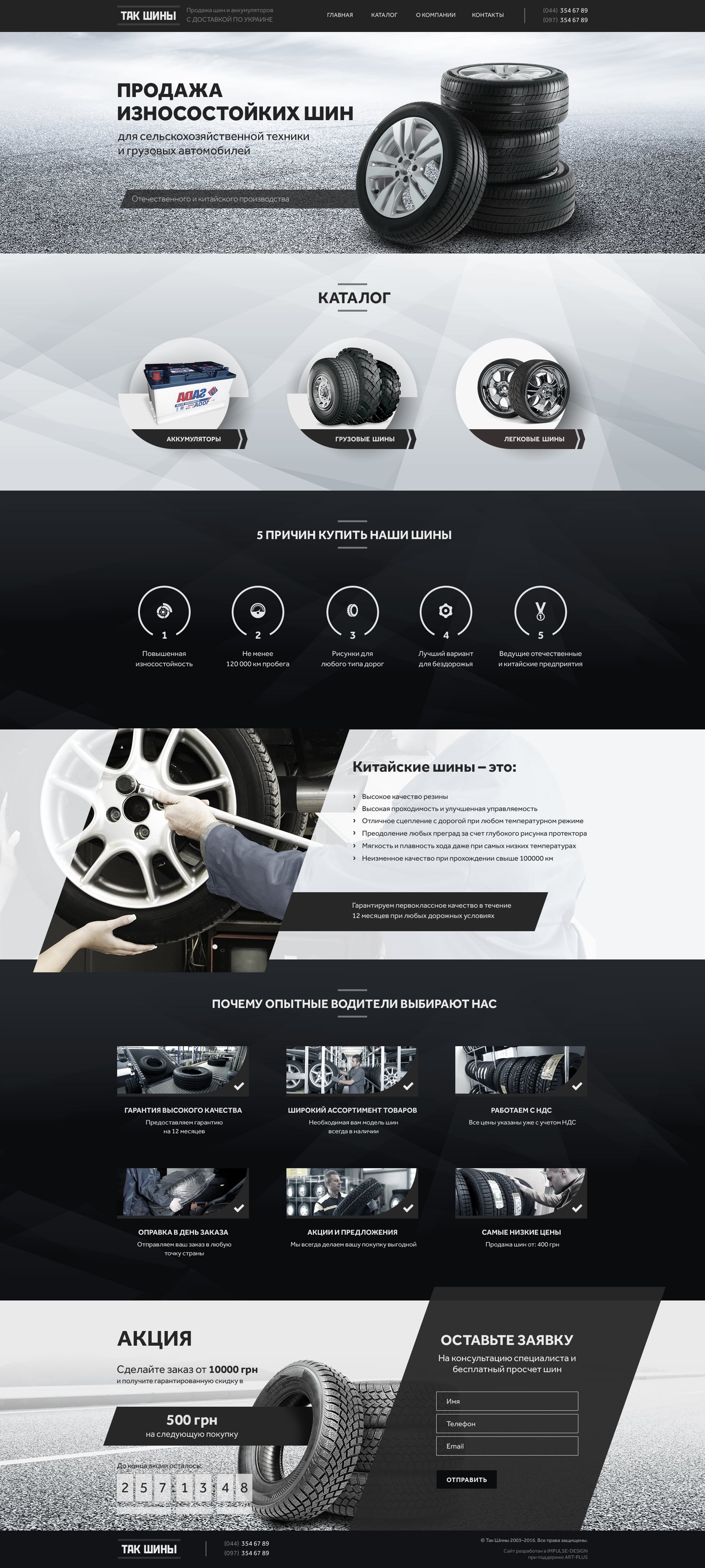 Для компанії з продажу автомобільних шин та акумуляторів ми створили сайт у комплексному виконанні Landing Page та інтернет-магазину. Нам вдалося поєднувати основні переваги сторінки, що продає, в стилі якої була створена головна, і зручність користування інтернет-магазину.