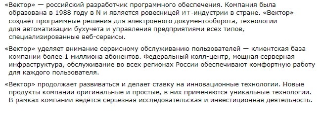 Інформація про те, що компанія, про яку йдеться у тексті, професіонал, або про те, що продукт виготовляється європейським обладнанням, не має вигоди потенційному покупцю. При інтересі товару, який купив товар, читач повинен бачити чітку вигоду для себе. Вона не повинна бути завуальована, як у разі виробництва на базі європейського обладнання, що має на увазі високу якість.
