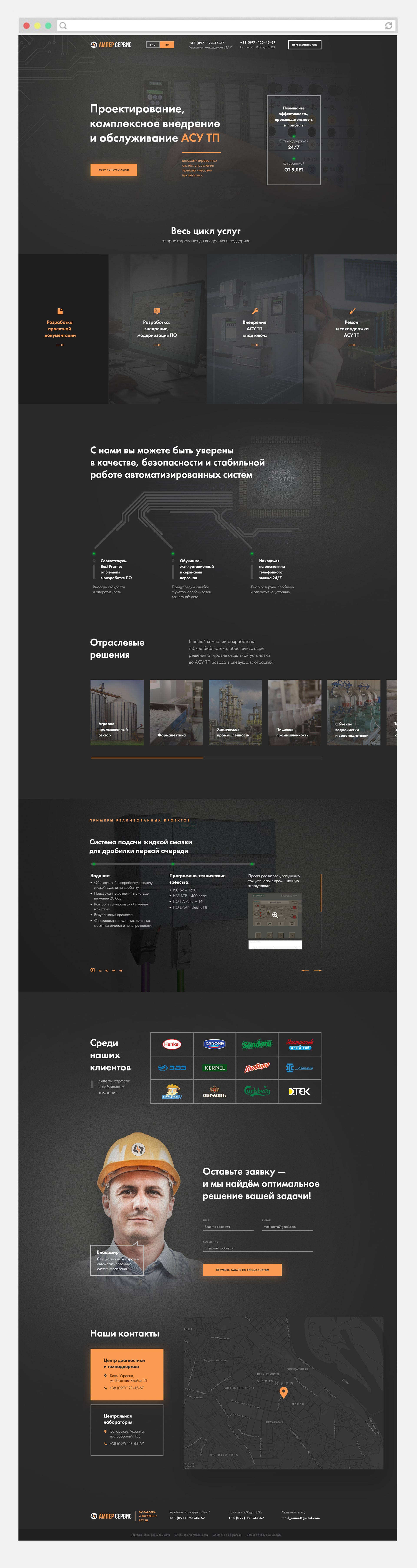 Landing Page з проектування АСУ ТП "Amper Service" включає повний опис діяльності компанії, але зберігає функції, що продають. Дизайн виконаний в індустріальному стилі, що наголошує на специфікі підприємства.