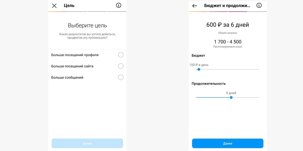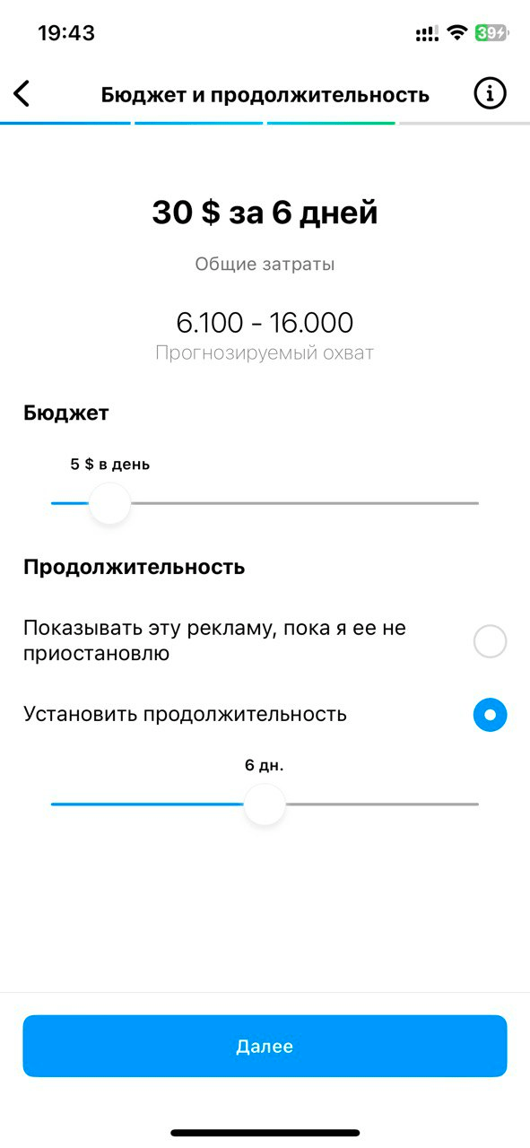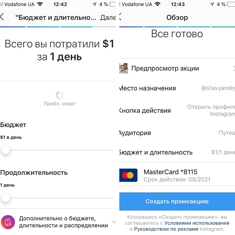 Налаштувавши рекламу Instagram, далі слід зазначити запланований бюджет. Тут усе досить просто. Вам необхідно вказати суму, яку ви готові вкласти у рекламну кампанію, а також термін її дії. Інстаграм автоматично зробить підрахунок та створить прогнози. Однак не радимо повністю покладатися на ці прогнози, оскільки вони досить плаваючі та можуть змінитися, виходячи з рівня залучення аудиторії.