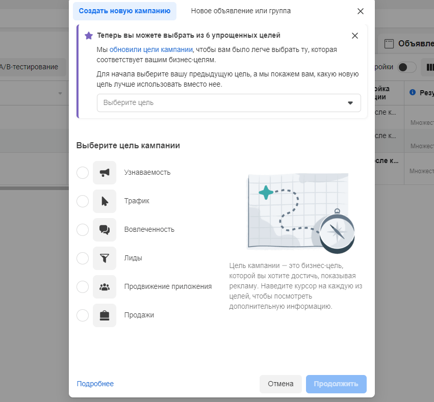 Виберіть мету серед запропонованих пунктів. До них відноситься конверсія, ліди та впізнаваність. Кожен вид розкриває багато підвидів, серед яких можна підібрати найточнішу мету вашої РК. Якщо ви не знаєте, який вигляд підходить, прочитайте мануал, запропонований соціальною мережею.