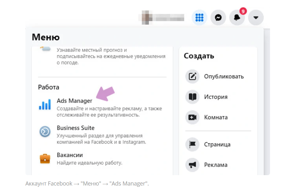 Для початку налаштування зайдіть в особистий кабінет і в меню виберіть Ads Manager. Вимкніть блокування реклами та спаму, якщо ФБ на це вказує.