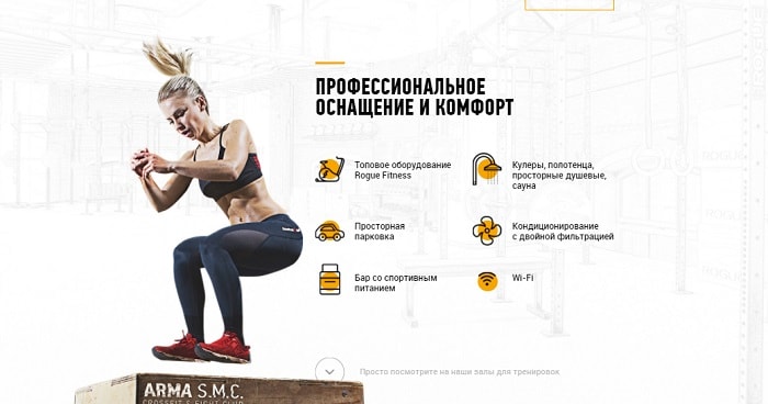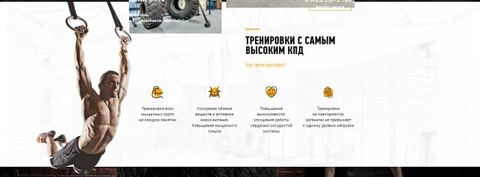 Унікальна картинка, стильна вставка з УТП, навігаційне меню, яскравий дизайн першого блоку та заголовок у стилі призову у загальному поєднанні викликають бажання записатися на пробне тренування. Сприяє цьому та розміщена кнопка із закликом до дії. Бракує навігаційної стрілки, яка повинна показувати, що внизу також є нова інформація. Наступний блок – переваги у вигляді критеріїв. Зроблені у вигляді іконок з коротким описом.