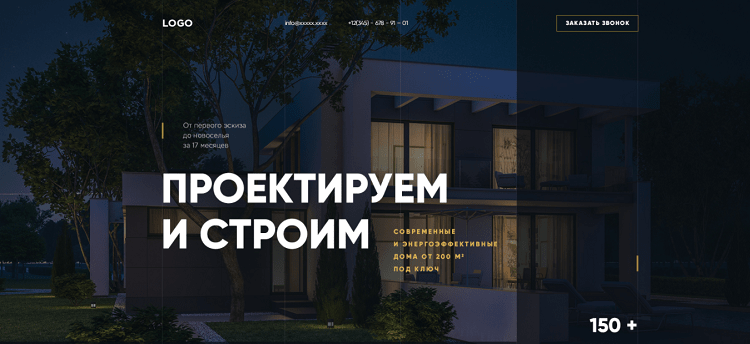 Стильний приклад посадкової сторінки, орієнтованої на продаж послуги – проектування та будівництво елітних приватних будинків та котеджів. Лендинг розроблений за маркетинговою стратегією AIDA – класика, яка невпинно демонструє свою ефективність.