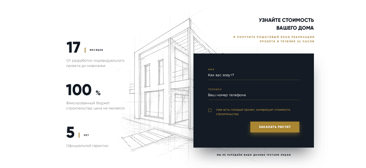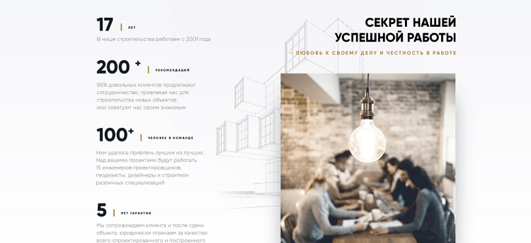 Головна мета односторінника – сформувати позитивне враження про компанію, її репутацію, що і стає основним мотиватором для цільової аудиторії, якою є забезпечені споживачі. Таку групу ЦА менше цікавить питання ціни, більше – імідж, можливості компанії-виконавця. Тому цільова сторінка спрямована на розкриття переваг будівельної компанії.