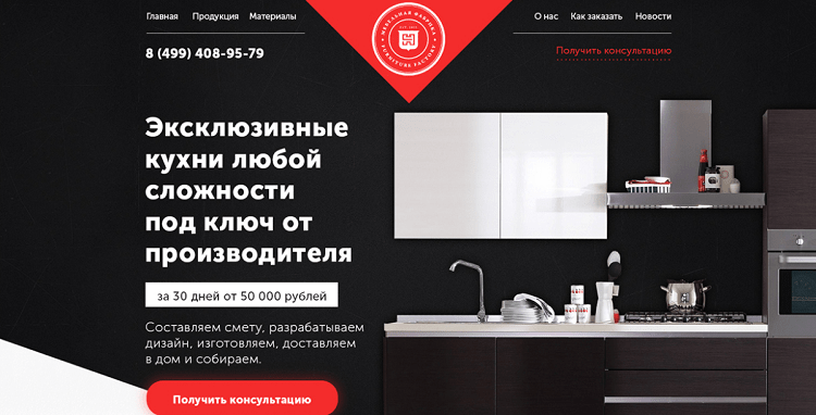 Це дуже зручна та практична функція, яка в режимі онлайн візуально демонструє користувачу всі пропозиції, які підходять за вартістю. Ще один плюс односторінника – орієнтація на всі запити цільового покупця. Відвідувач за допомогою цього лендингу може отримати консультацію, зробити замовлення, зорієнтуватися у вартості кухонного гарнітура, а також отримати кошторис на замовлення. До кожної можливості додається заклик до дії.