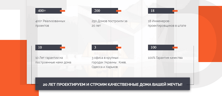 Цей лендінг пейдж, який був розроблений нашою веб-студією, з першого розвороту екрана утримує відвідувача і мотивує його до дії. Цільова сторінка, присвячена продажу послуг проектування та будівництва, відкриває багато можливостей для клієнта. Підтвердженням тому є форма зворотного зв'язку, що дозволяє одразу замовити індивідуальний проект або завантажити безкоштовний приклад проекту.